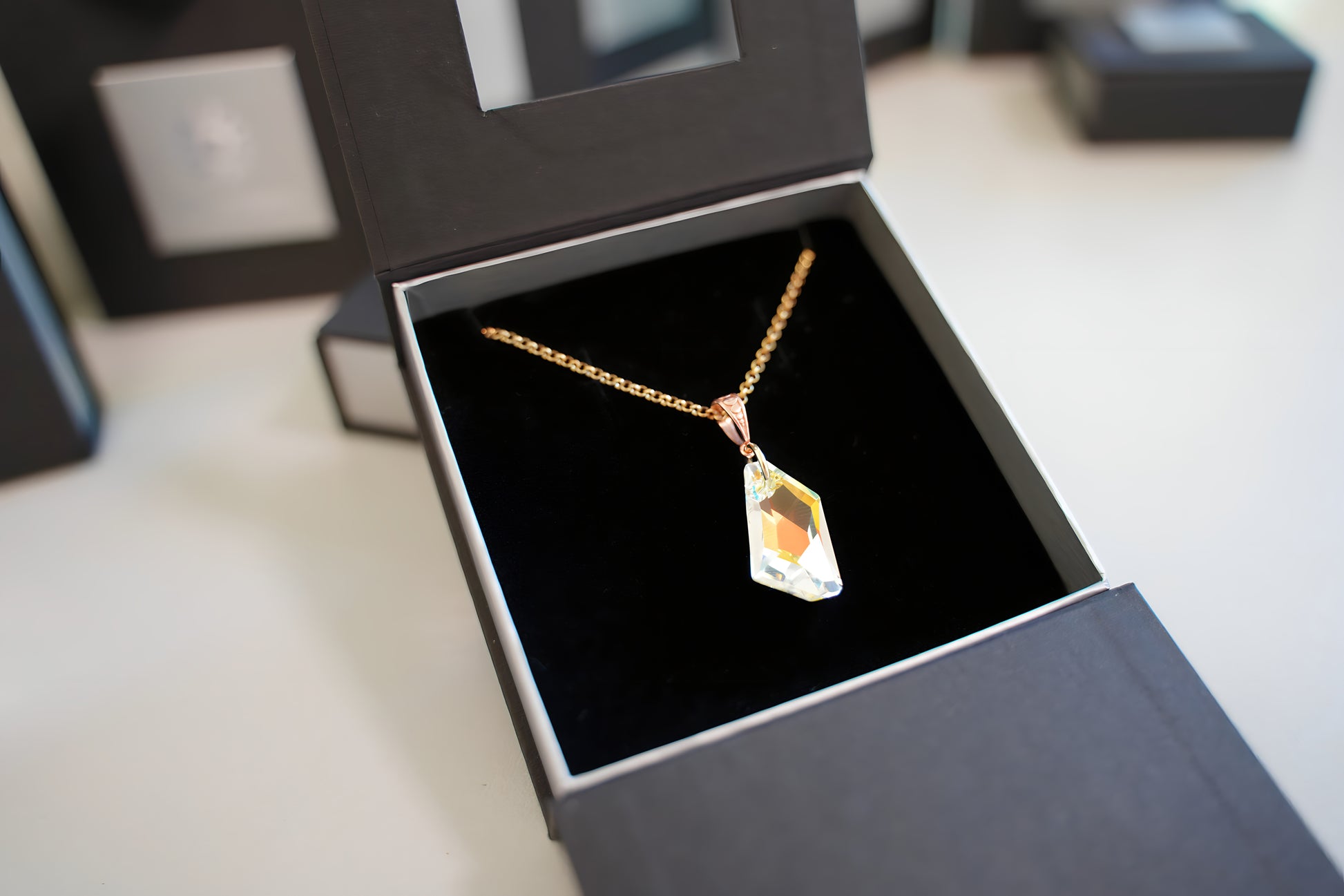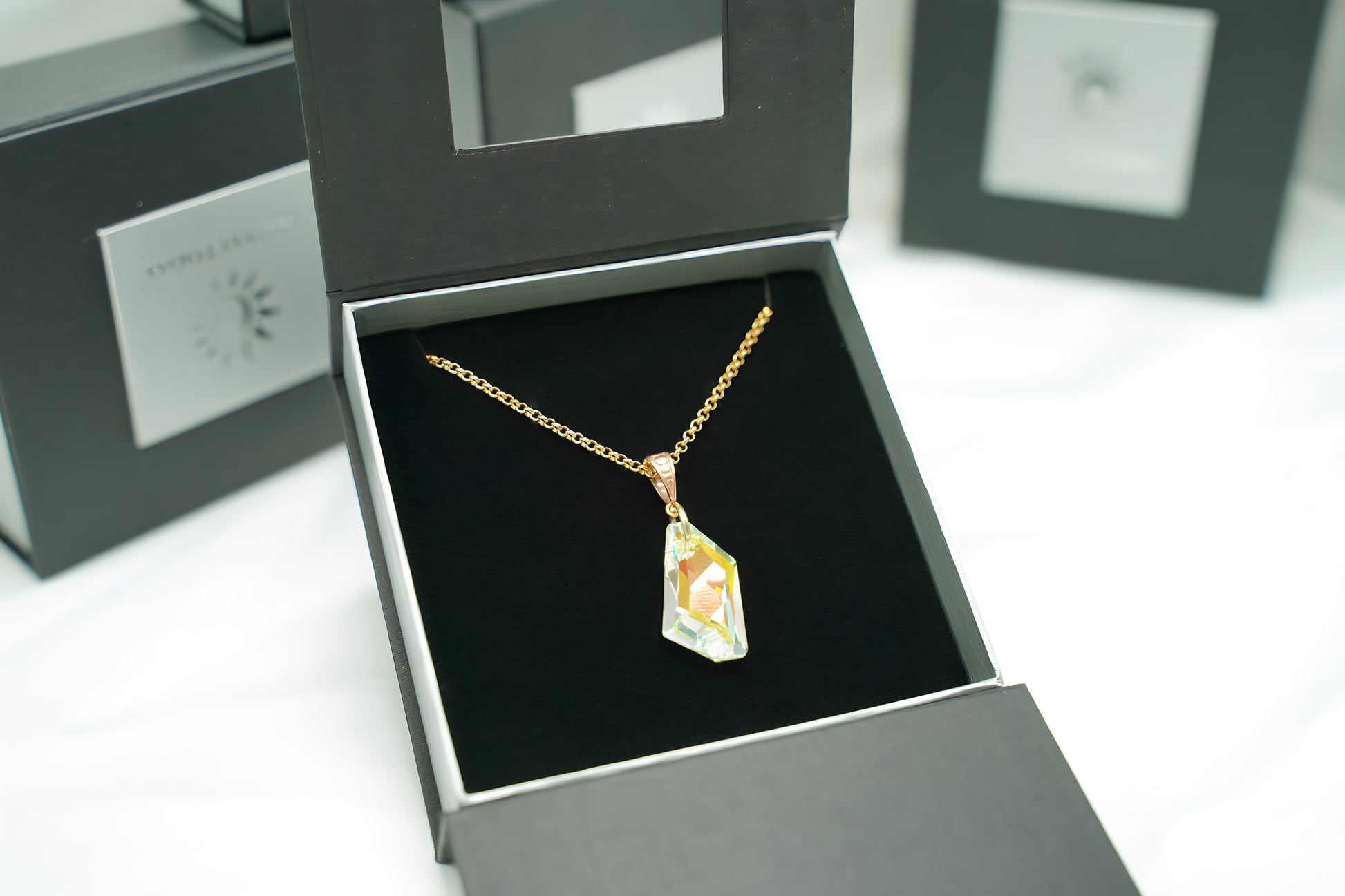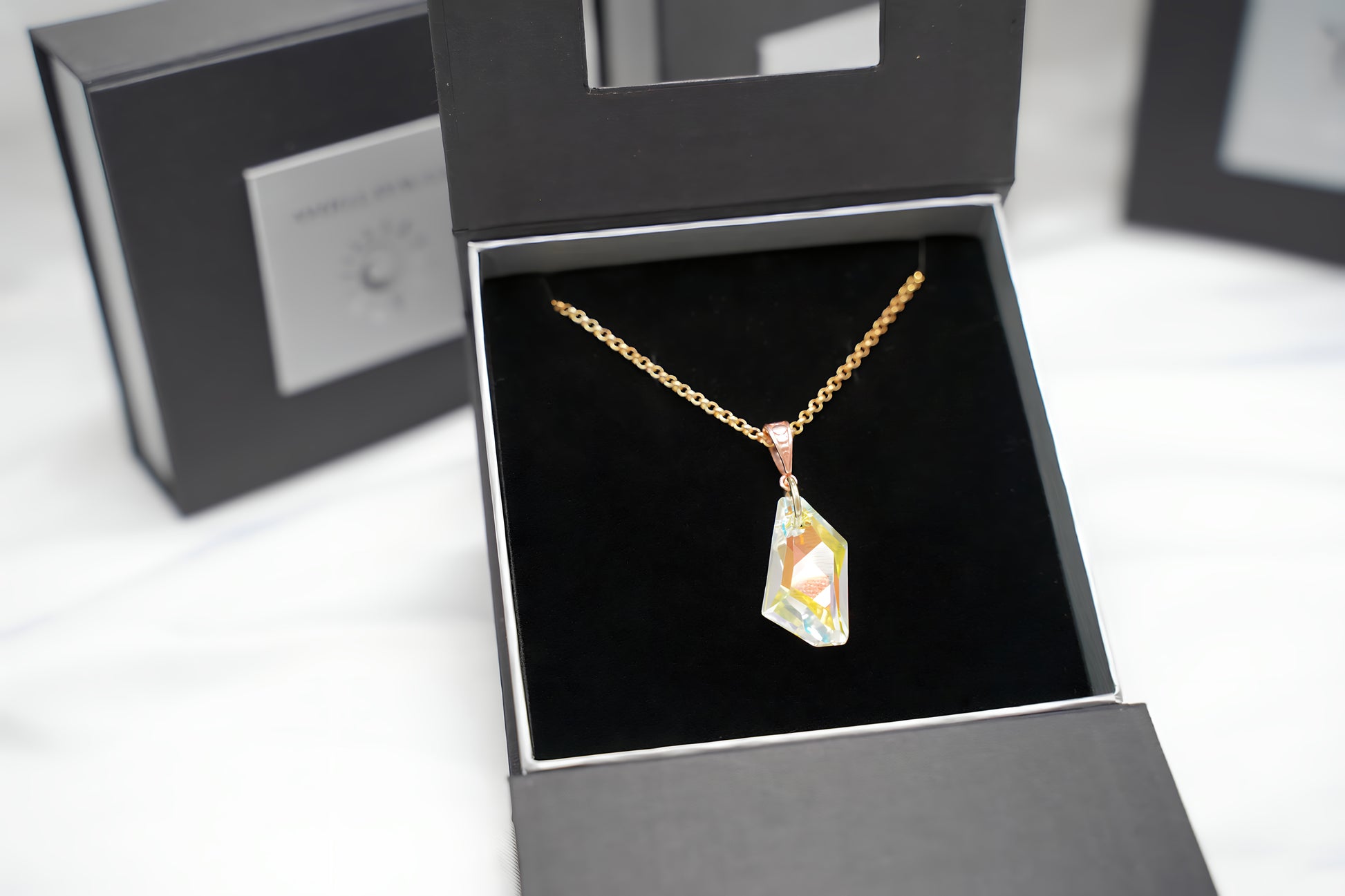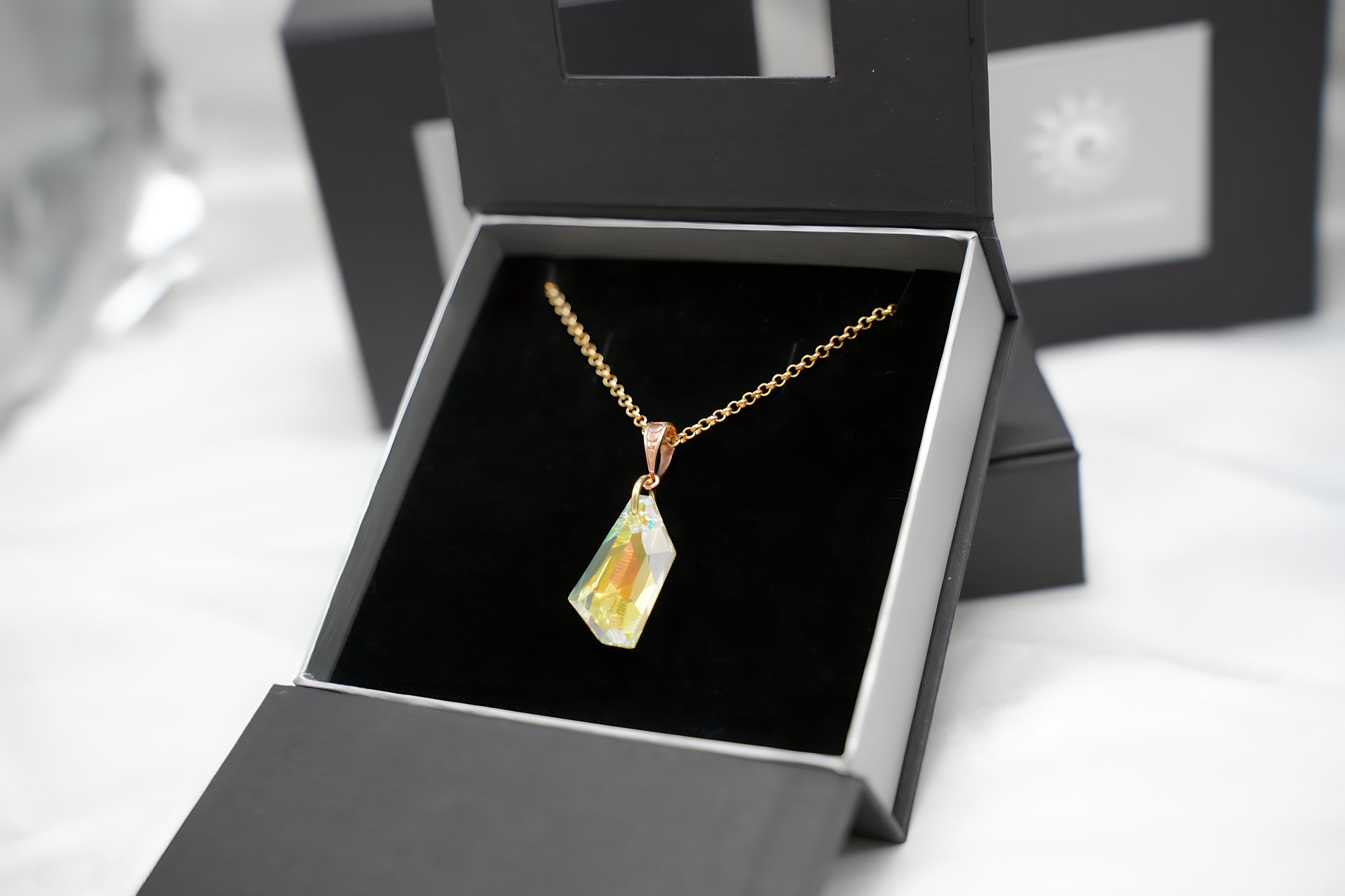 Dieser exklusive Anhänger präsentiert den einzigartigen Swarovski® Fantasia Kristall in freier, facettierter Form und warmem Honiggelb. Die unregelmäßigen Facetten fangen das Licht in lebhaften Reflexionen ein. An einer feinen Ankerkette aus 925er Sterling-Silber mit Karabinerverschluss getragen, vereint dieses Schmuckstück modernen Chic mit zeitloser Eleganz.