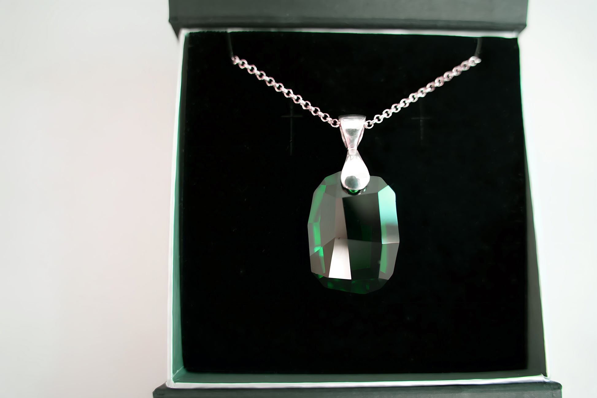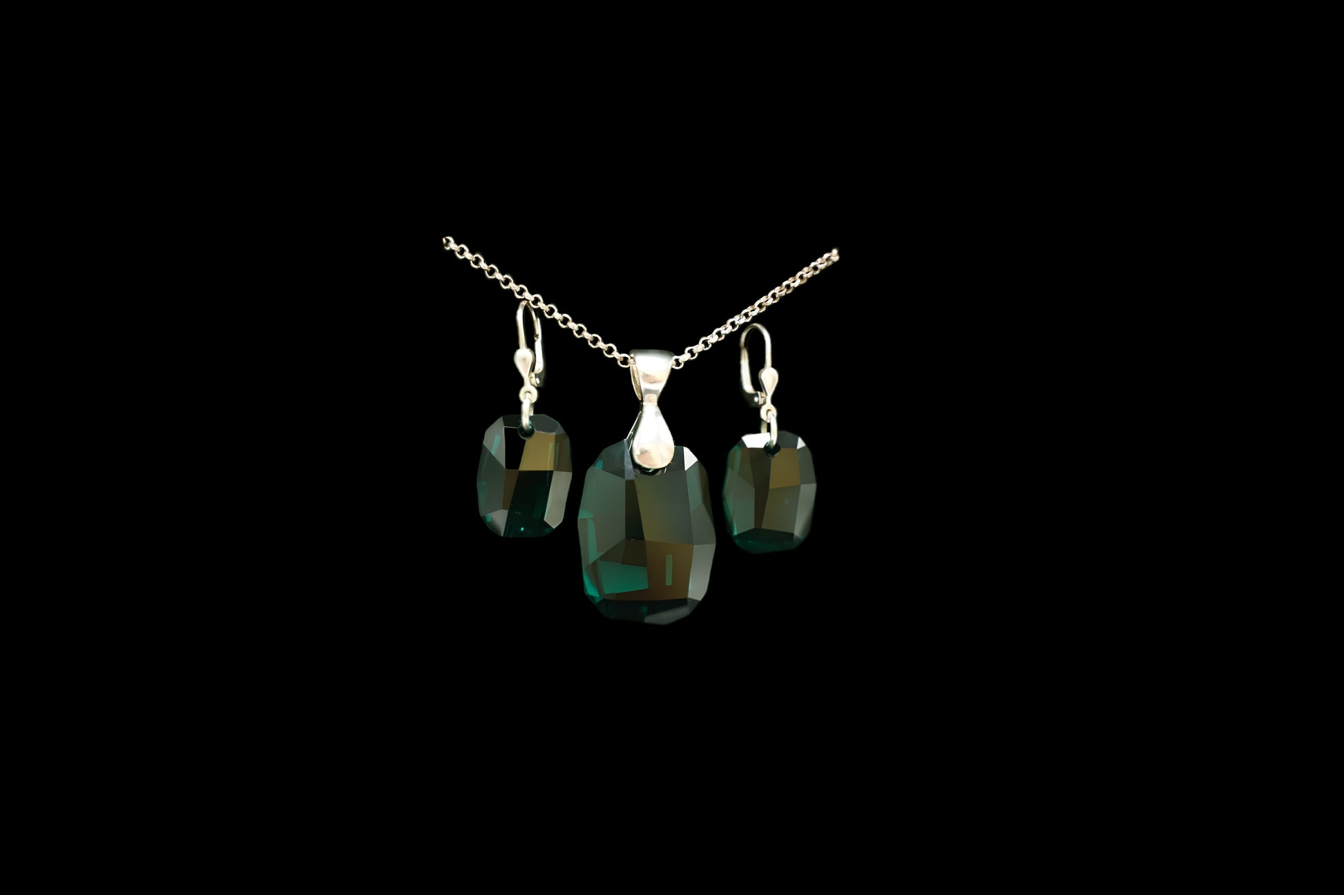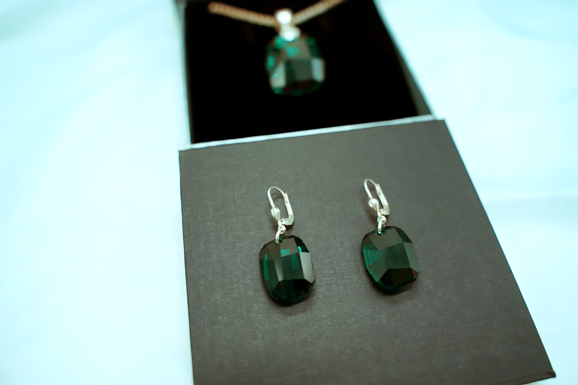 Dieses exklusive Set vereint einen Anhänger und passende Ohrringe mit facettierten Swarovski® Kristallen im satten Smaragdgrün in klassischer Cushion-Cut-Form. Die weich gerundeten Ecken und klaren Facetten erzeugen ein lebendiges Spiel aus Licht und Farbe. Anhänger und Ohrringe hängen an feiner Ankerkette bzw. an sicheren Klappbrisuren aus 925er Sterling-Silber und bieten hohen Tragekomfort sowie zeitlose Eleganz.