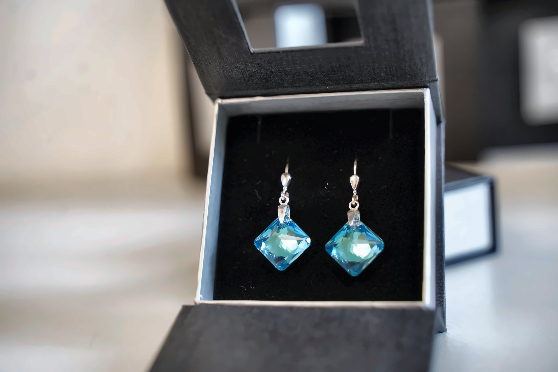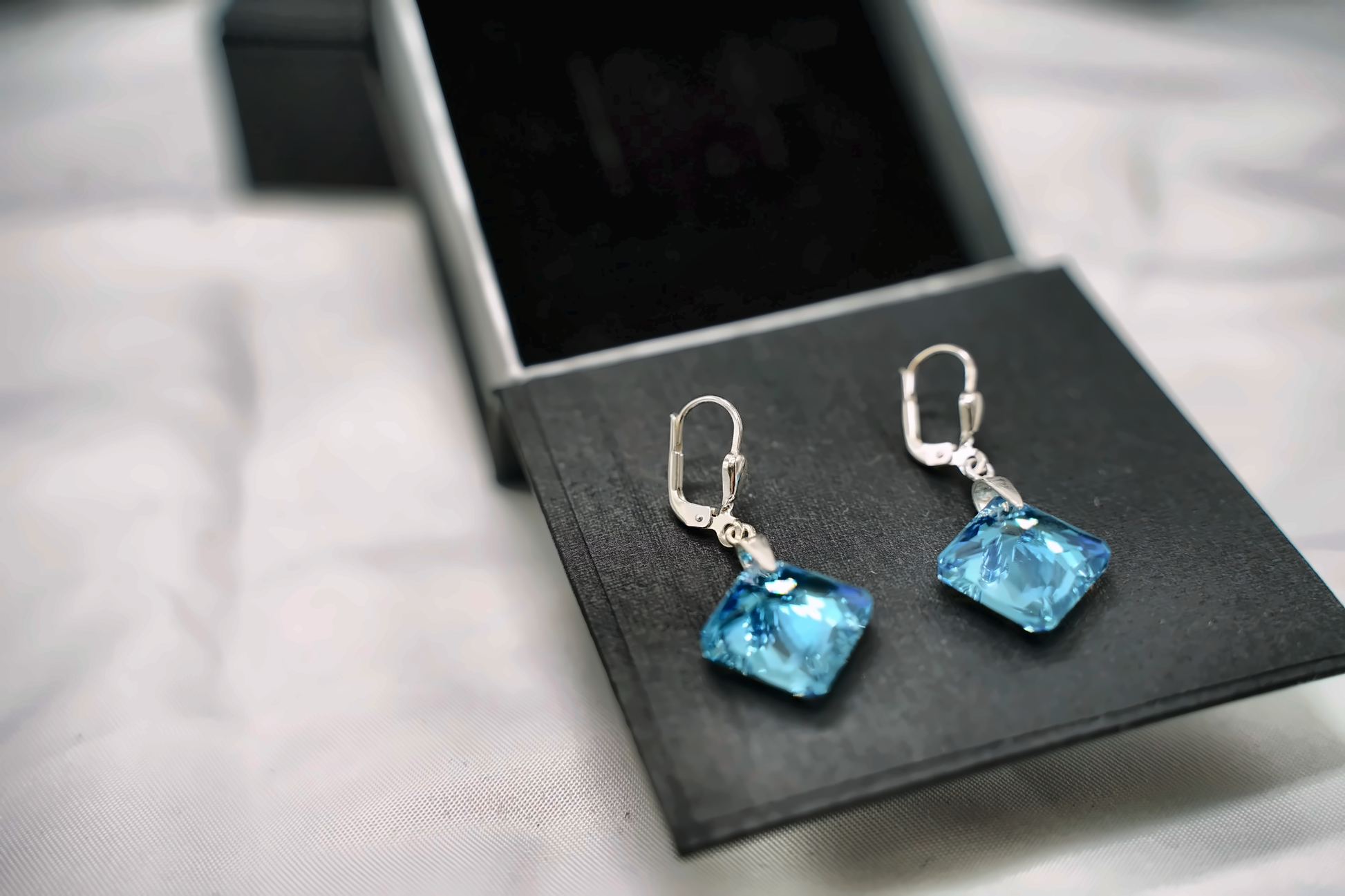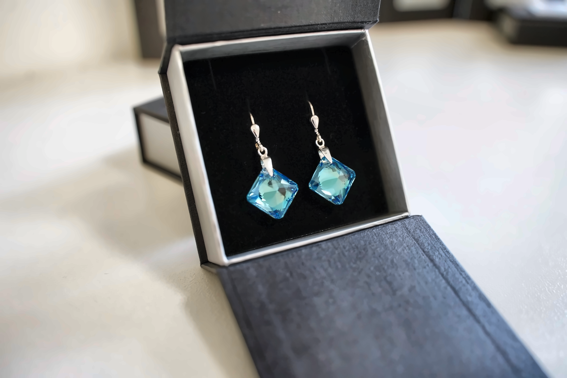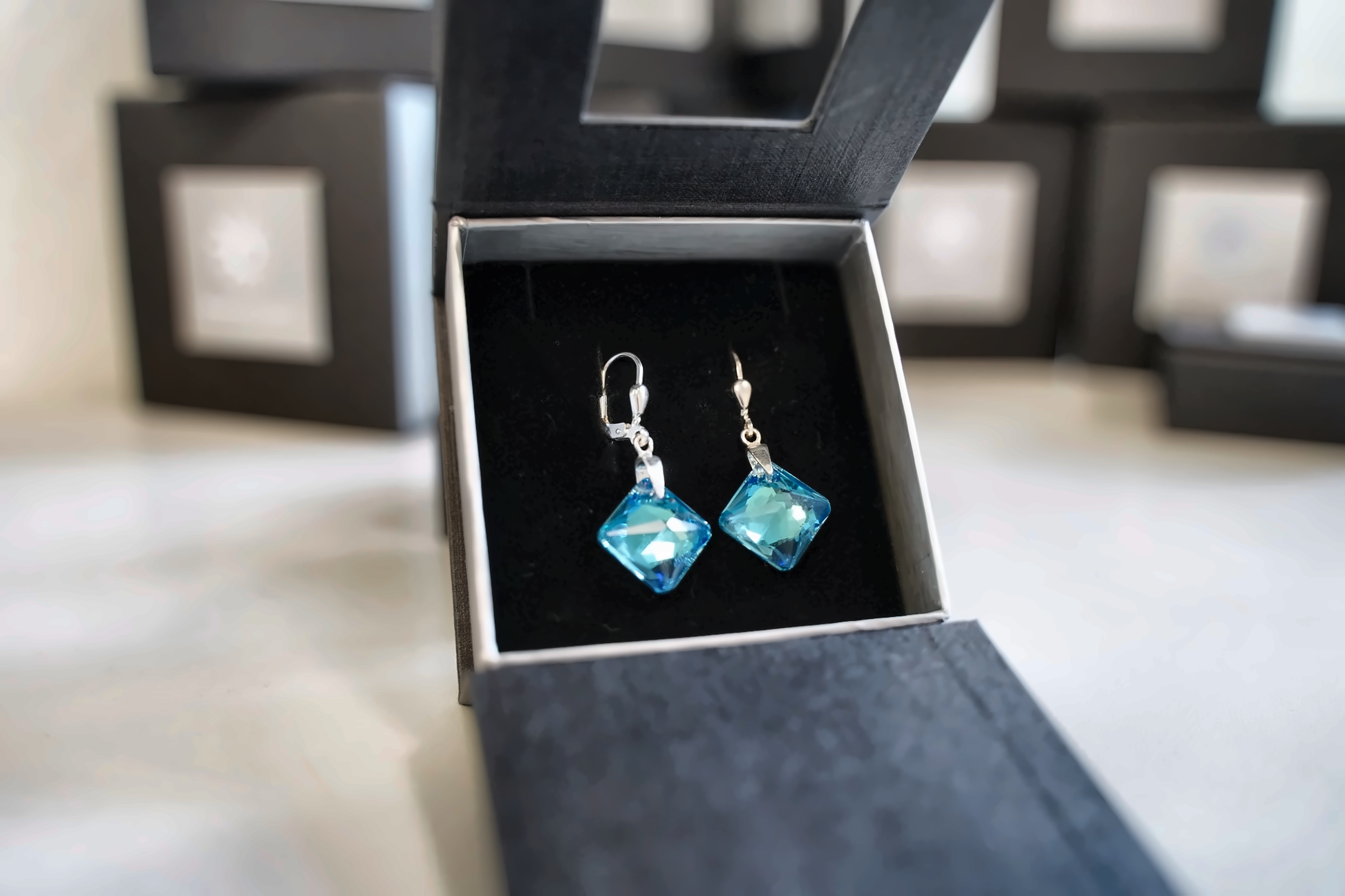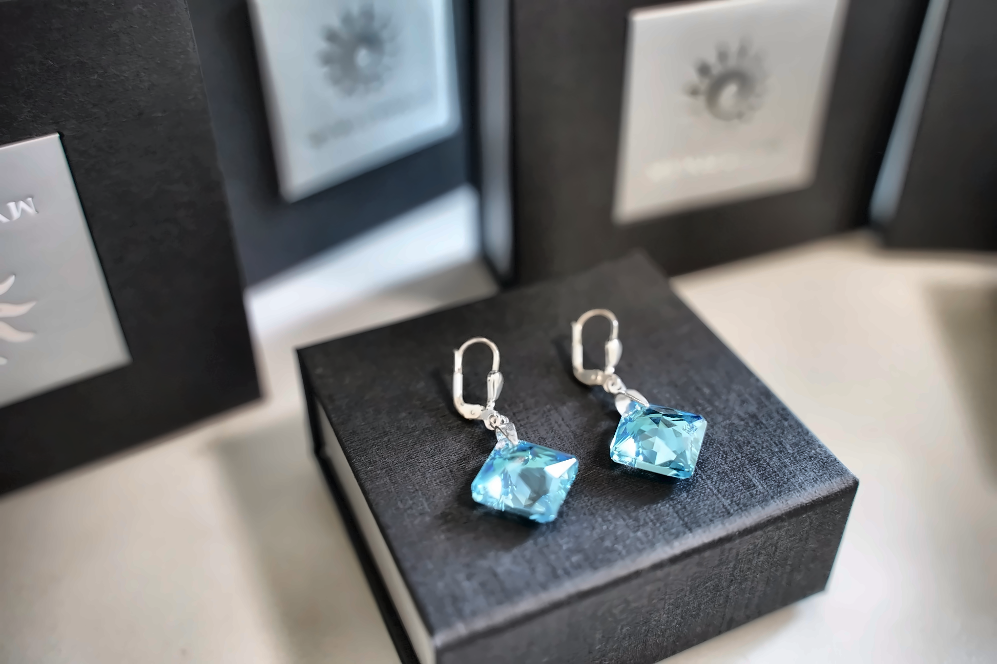 Diese eleganten Ohrringe präsentieren facettierte Cushion-Cut Kristalle in leuchtendem Aquamarin-Blau von Swarovski®. Die sanft gerundeten Ecken und präzisen Facetten fangen Licht intensiv ein und erzeugen funkelnde Reflexe. An robusten Klappbrisuren aus 925er Sterling-Silber montiert, bieten sie sicheren Halt und hohen Tragekomfort. Ein frischer, zeitloser Blickfang für jeden Anlas