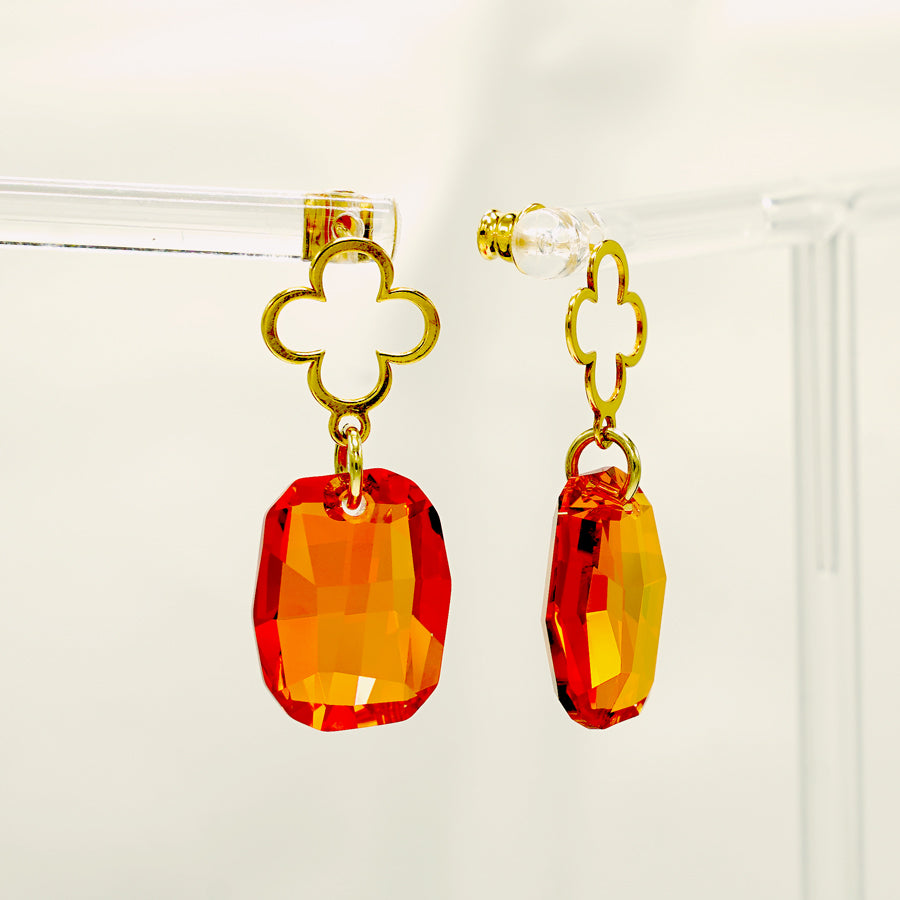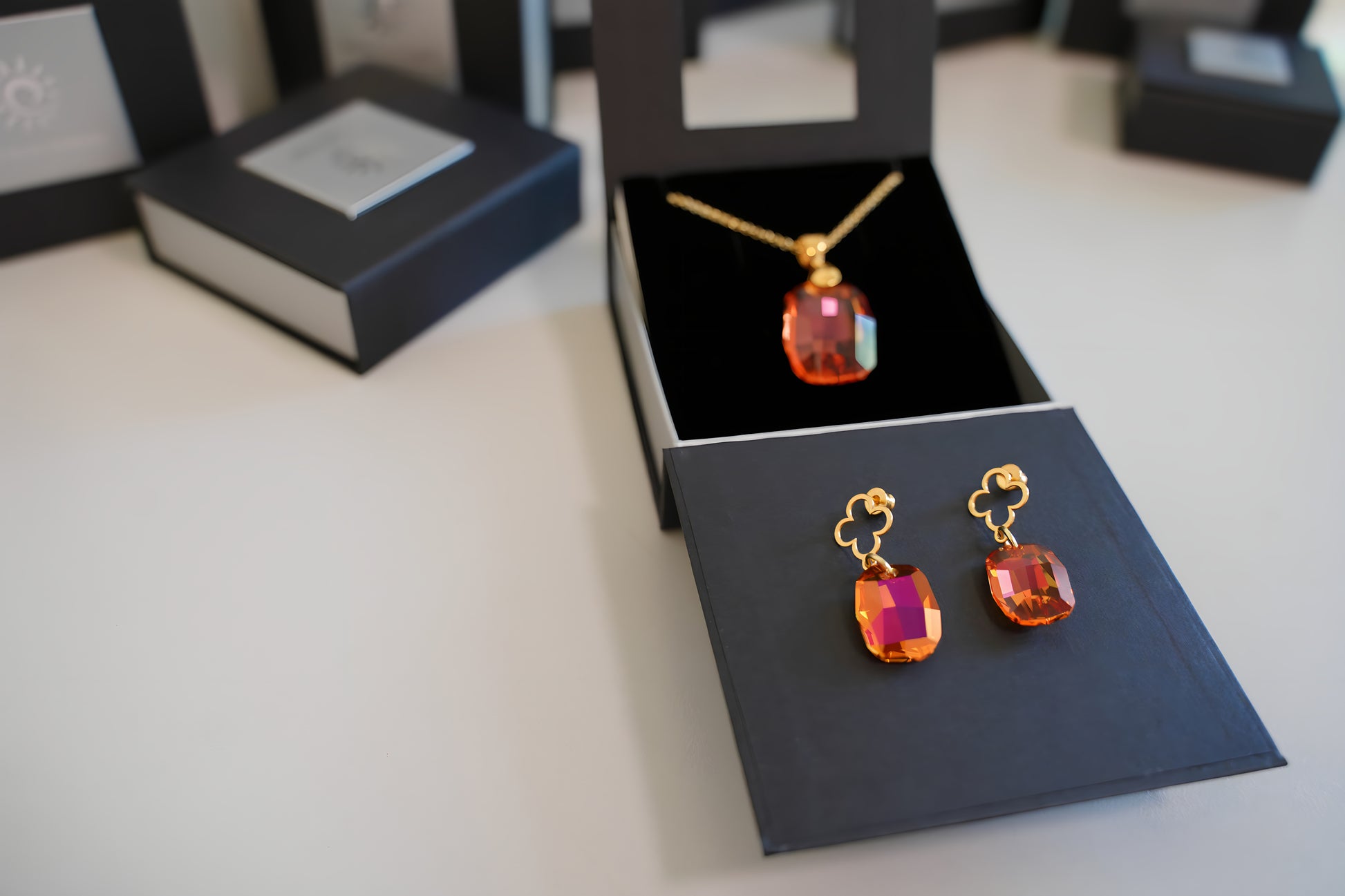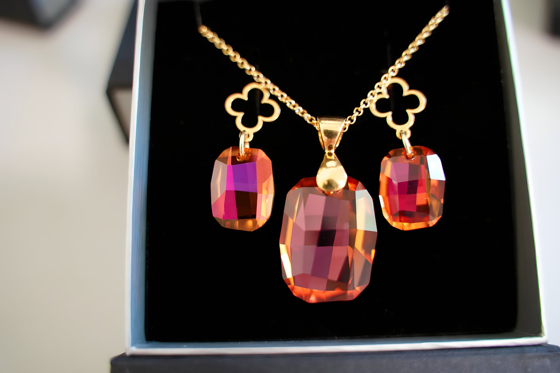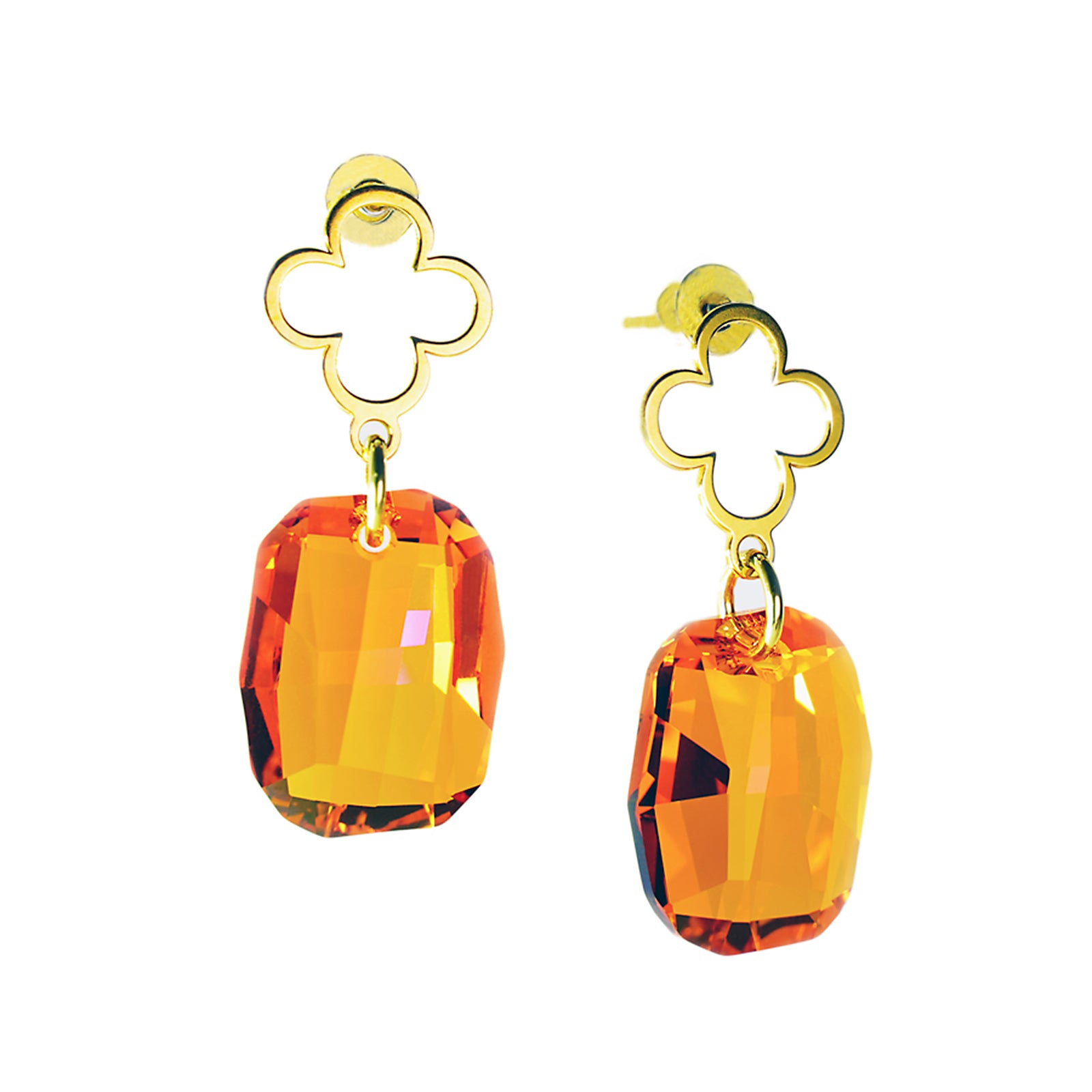 Dieses luxuriöse Set vereint einen Anhänger und passende Ohrringe mit identischen Cushion-Cut Swarovski® Kristallen im warmen Amber-Gold-Ton. Die weichen, abgerundeten Facetten fangen das Licht brillant ein und erzeugen funkelnde Reflexe. Die Ohrhänger sind an filigranen Quatrefoil-Elementen aus vergoldetem 925er Sterling-Silber befestigt und verfügen über sichere Leverback-Verschlüsse, der Anhänger hängt an einer feinen Ankerkette aus vergoldetem 925er Sterling-Silber mit Karabinerverschluss. Ein elegantes Duo, das mit seiner harmonischen Form und intensiven Farbnuance jedem Look zeitlose Eleganz verleiht.