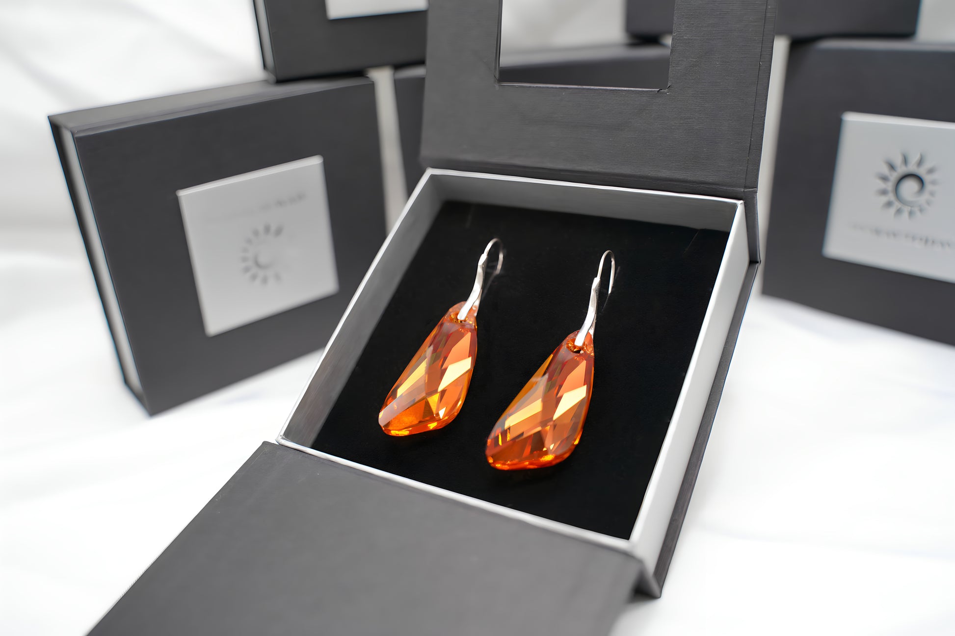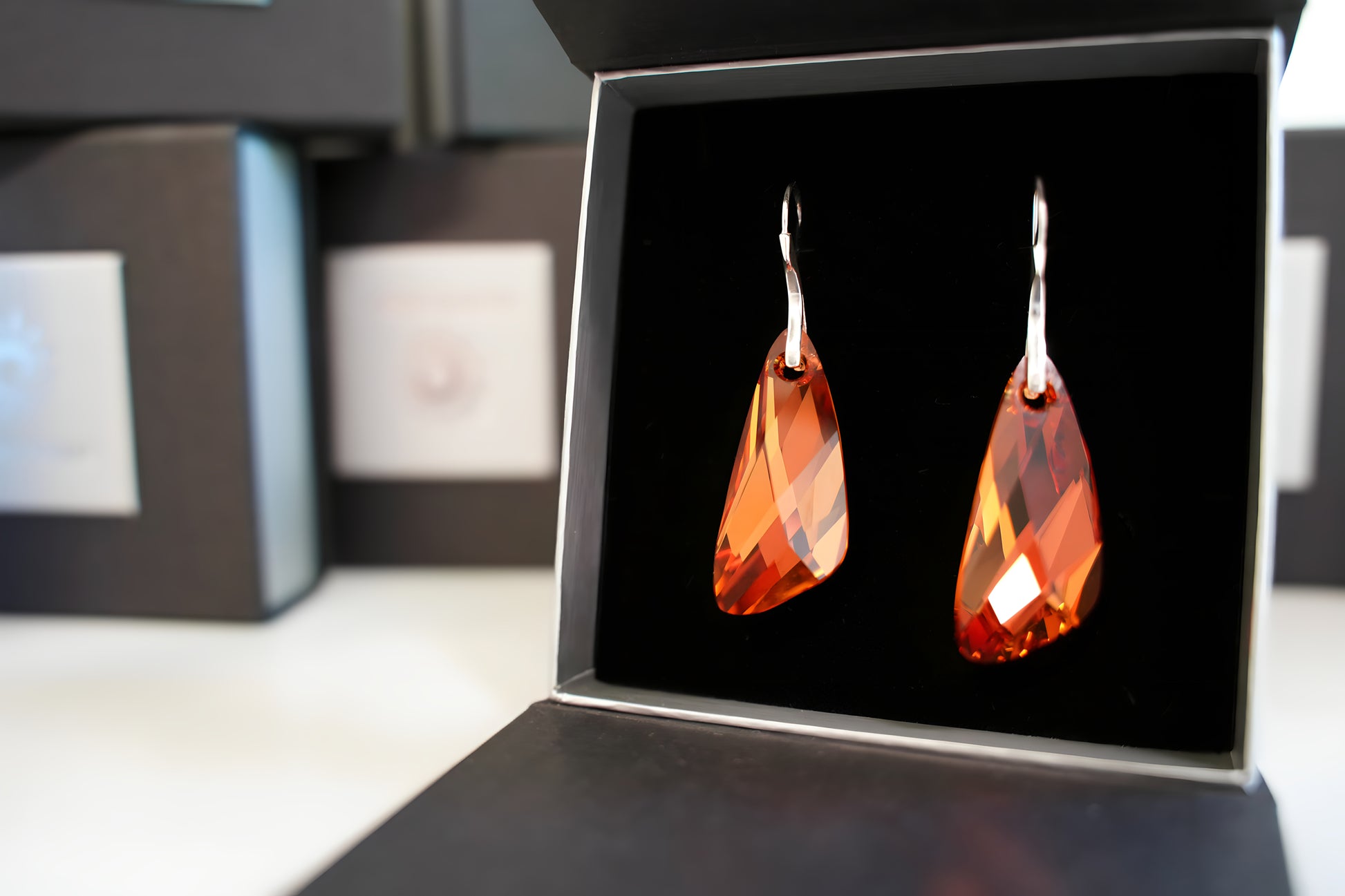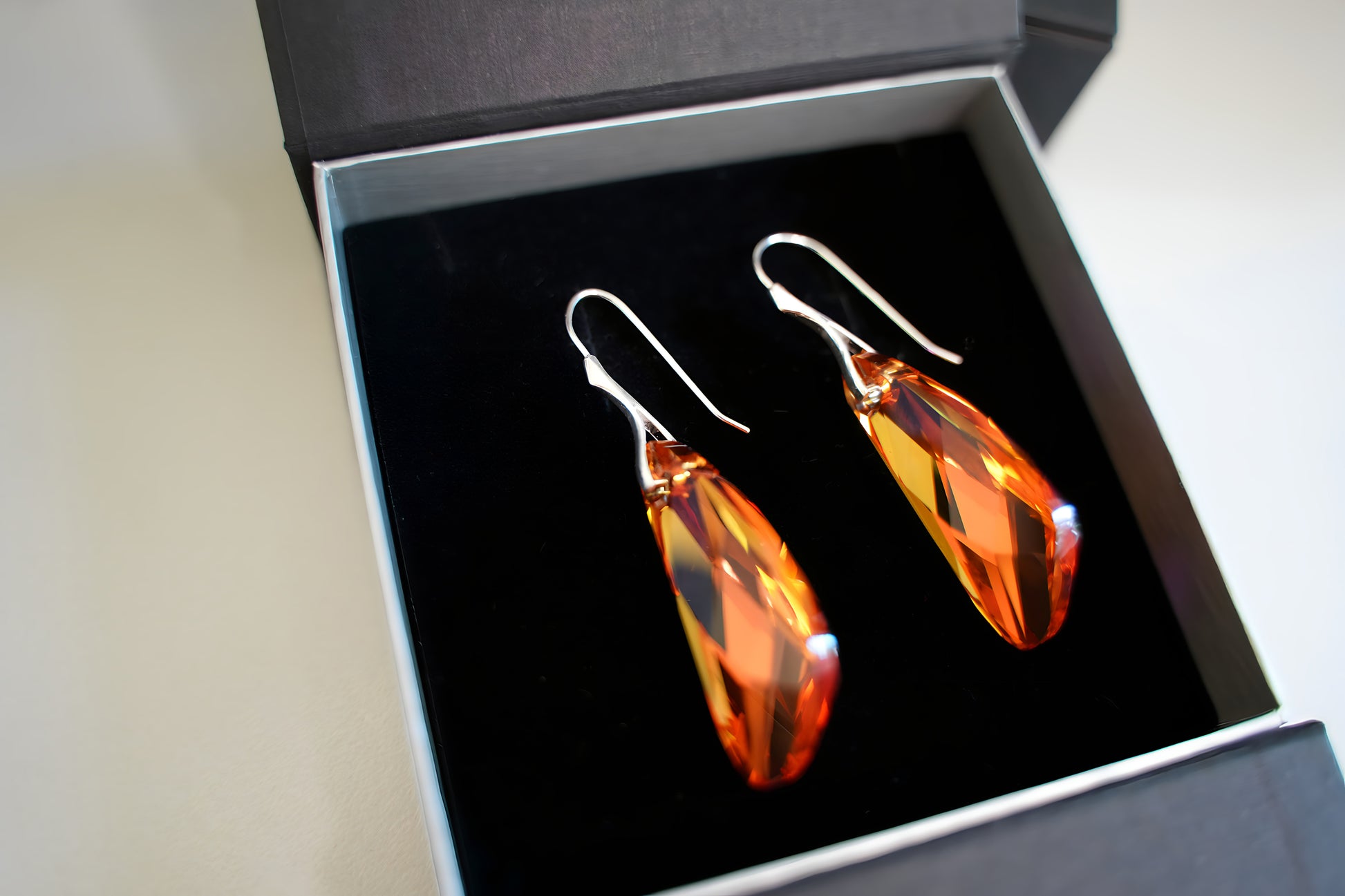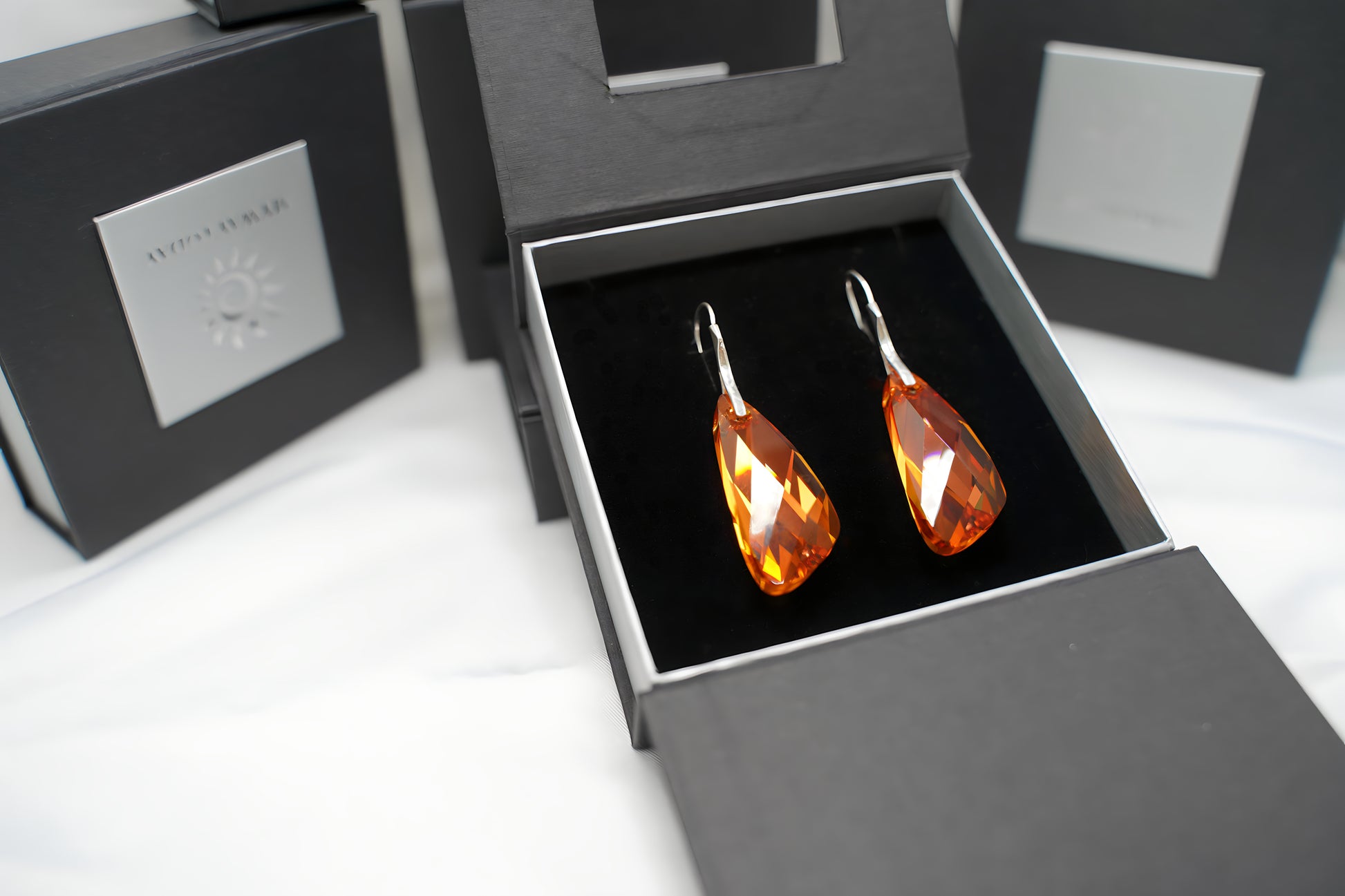 Diese ausdrucksstarken Ohrringe präsentieren langgezogene, facettierte Swarovski® Kristalle im warmen Amber-Gold-Ton, die an filigranen Ohrhaken aus 925er Sterling-Silber frei baumeln. Die präzisen Facetten erzeugen ein lebhaftes Spiel aus Licht und Farbe, während die schlanke Tropfenform das Dekolleté elegant umspielt. Ein kraftvolles, zugleich feminines Accessoire, das jedem Look warmen Glanz und markante Eleganz verleiht.