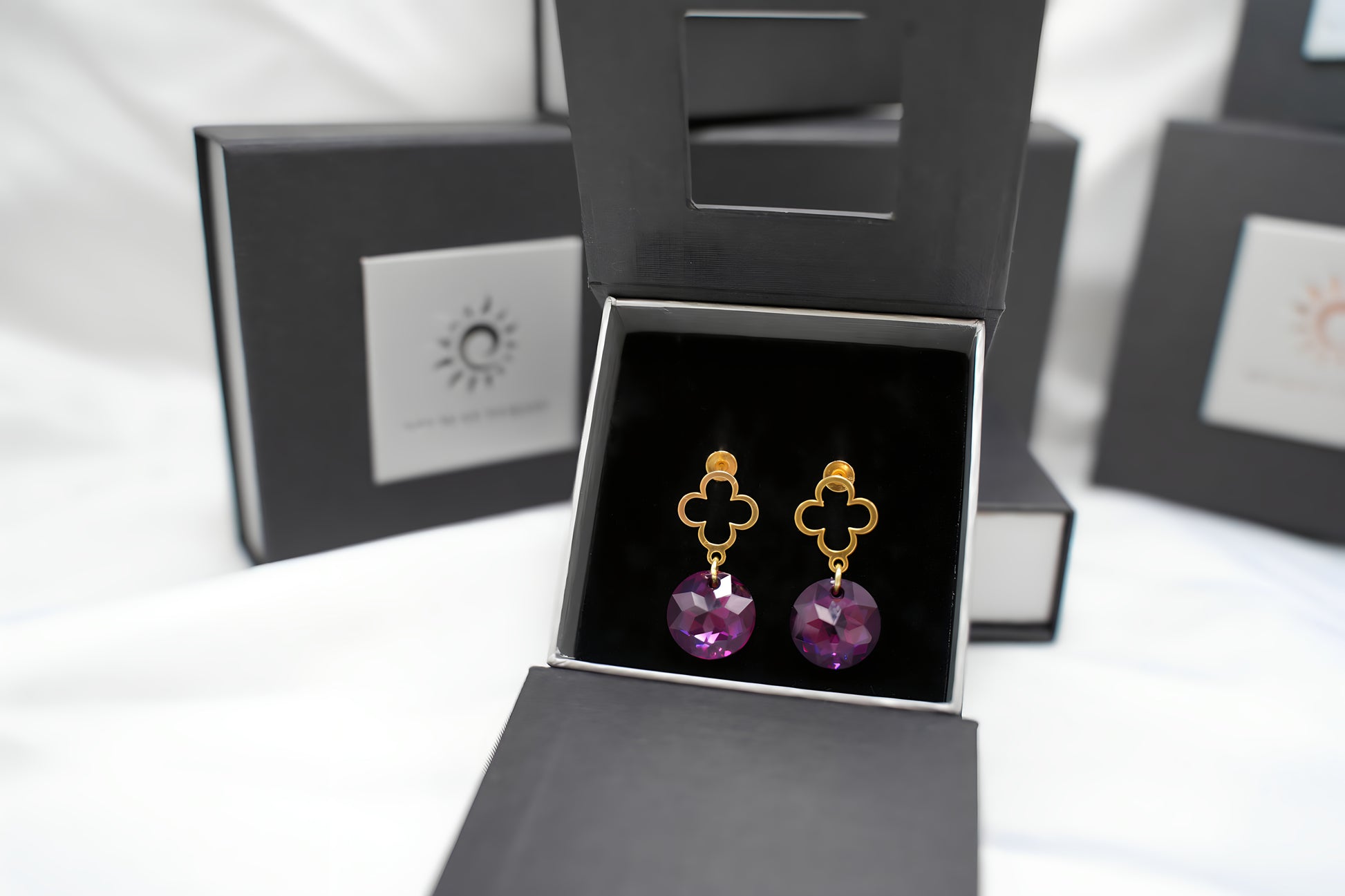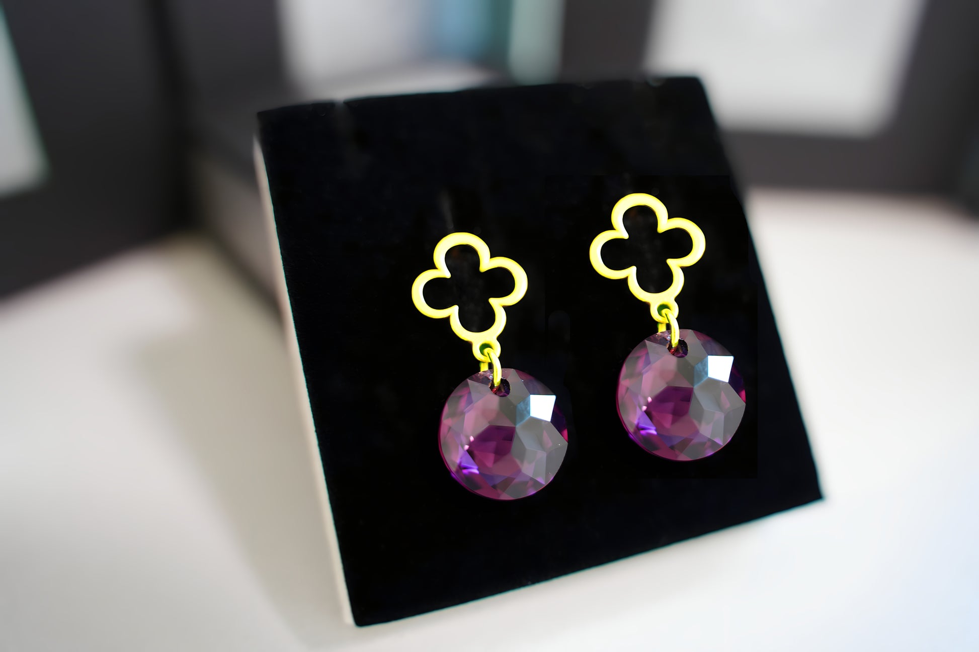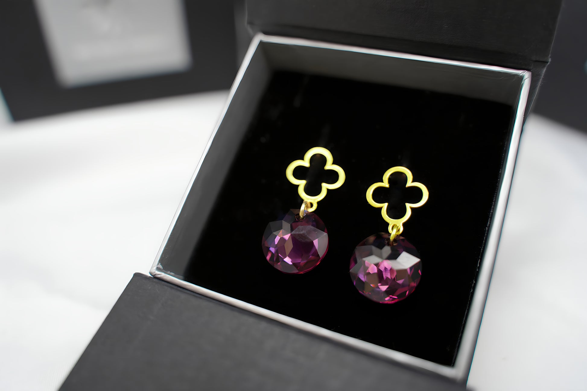 Diese eleganten Stecker (Gvozdiki) präsentieren runde, facettierte Disc-Kristalle von Swarovski® in intensivem Amethyst-Violett. Über filigrane Quatrefoil-Elemente aus vergoldetem 925er Sterling-Silber laufen die Kristalle frei nach unten und fangen das Licht aus jedem Blickwinkel ein. Die präzise Steckerfassung mit Schmetterlingsverschluss sorgt für sicheren Halt und hohen Tragekomfort. Ein funkelnder Akzent, der sowohl im Alltag als auch zu festlichen Anlässen lebendige Farbe und zeitlose Anmut verleiht.
