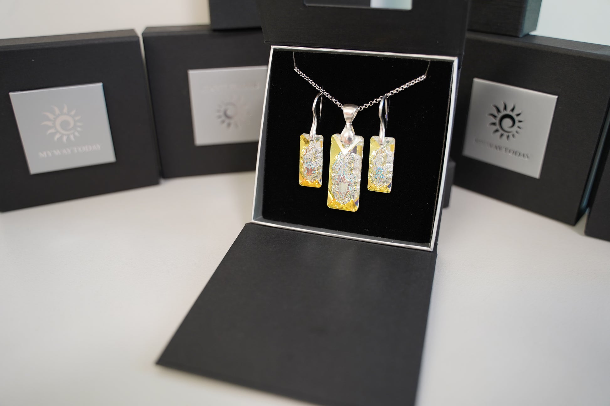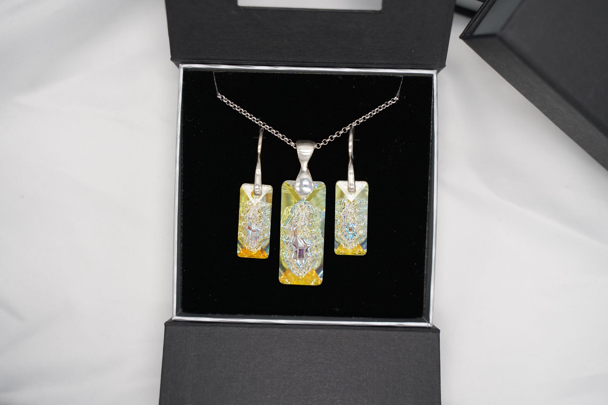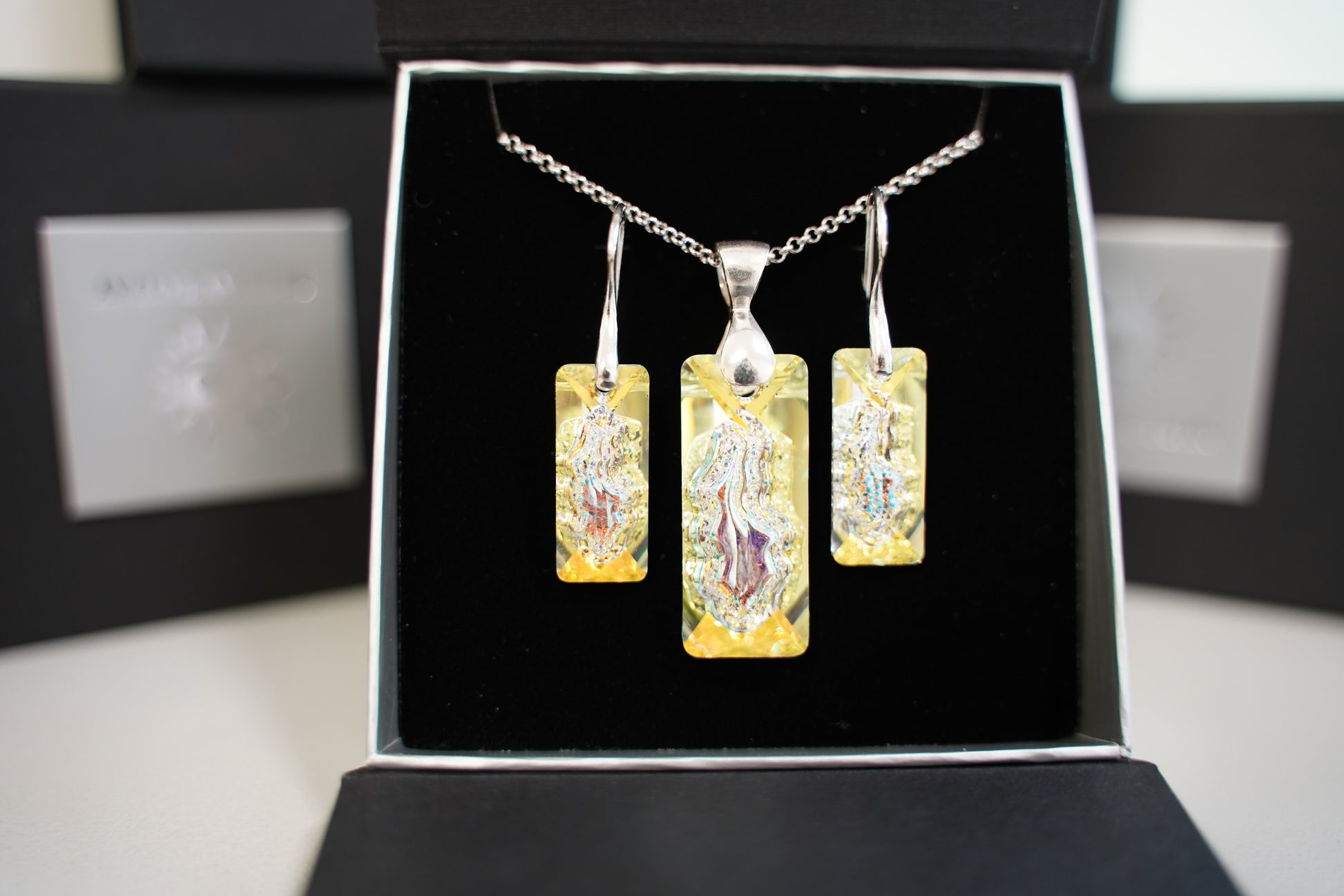 Dieses kunstvolle Set vereint einen Anhänger und passende Ohrringe mit facettierten, rechteckigen Swarovski® Kristallen in zartem Bernstein-Gelb. Die Baroque-Form begeistert durch ihre unregelmäßige, wellenförmige Innenstruktur, die das Licht in funkelnden Farbreflexen bricht. Der Anhänger hängt an einer feinen Ankerkette aus 925er Sterling-Silber mit Karabinerverschluss, die Ohrhänger sind an eleganten Creolen-Scharnieren (Ring-Ösen) aus 925er Sterling-Silber befestigt. Ein originelles Ensemble, das mit seiner harmonischen Formensprache und warmen Farbnuance jedem Look künstlerische Eleganz verleiht.